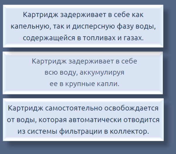 Механические загрязнения остаются на внутренней полости картриджей, а капли воды, выделенной из топлива, укрупняются и падают в отстойную зону корпуса фильтра.